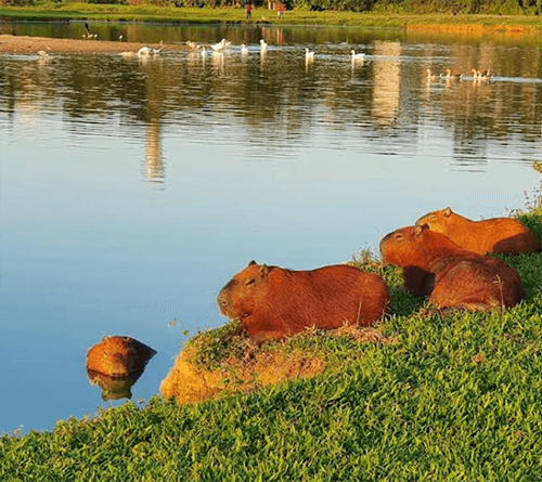 Símbolo do Parque Barigui, as capivaras são, sem dúvida, os animais mais lembrados por quem visita o local. Esses mamíferos, considerados os maiores roedores do mundo, circulam livremente pelas margens da lagoa e pelas áreas gramadas, sempre em grupos familiares. Sua presença constante tornou-se parte da identidade do parque e uma das maiores atrações para turistas e moradores.